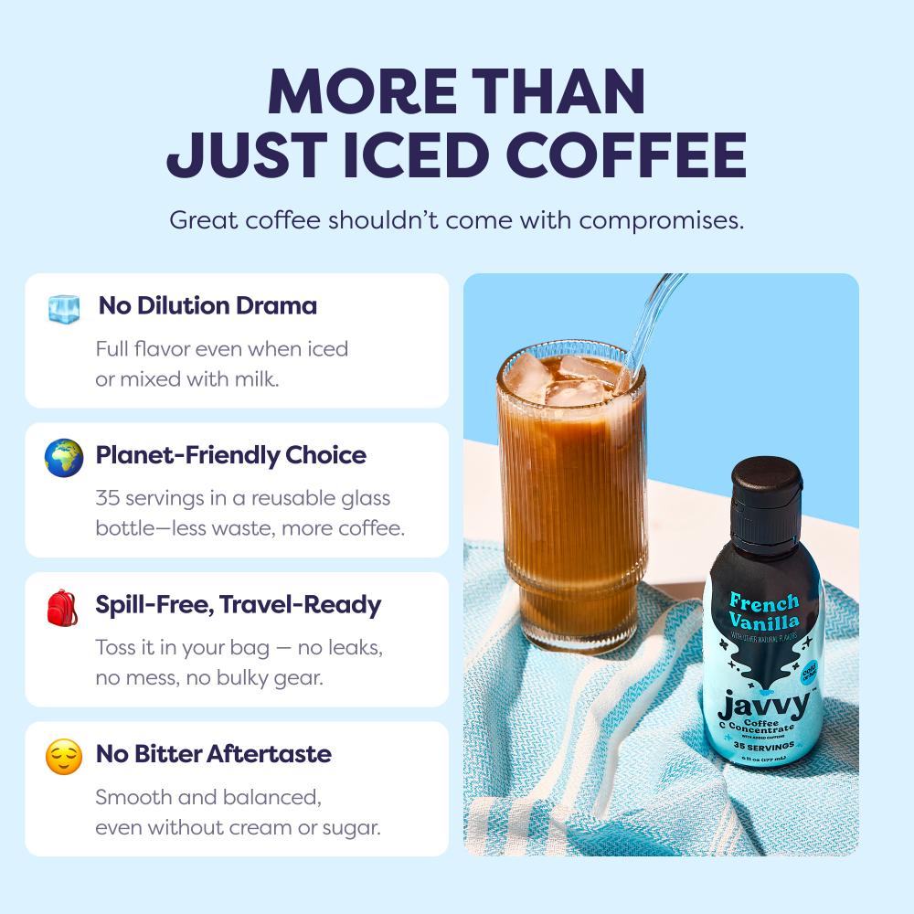 Javvy Coffee Concentrate is the fastest, easiest way to enjoy better coffee - without the sugar, hassle, or compromise. Javvy Coffee Concentrate delivers 100% real coffee with naturally derived ingredients, zero sugar, and no artificial flavors, all in a variety of crave-worthy options. With 80mg of caffeine per serving, each bottle brews up 35 rich, satisfying cups — hot or iced — in seconds. It’s gluten-free and guilt-free, so you can indulge in better-tasting coffee, faster. With this bundle, you’ll also receive a recipe booklet featuring our customers’ favorite creations.