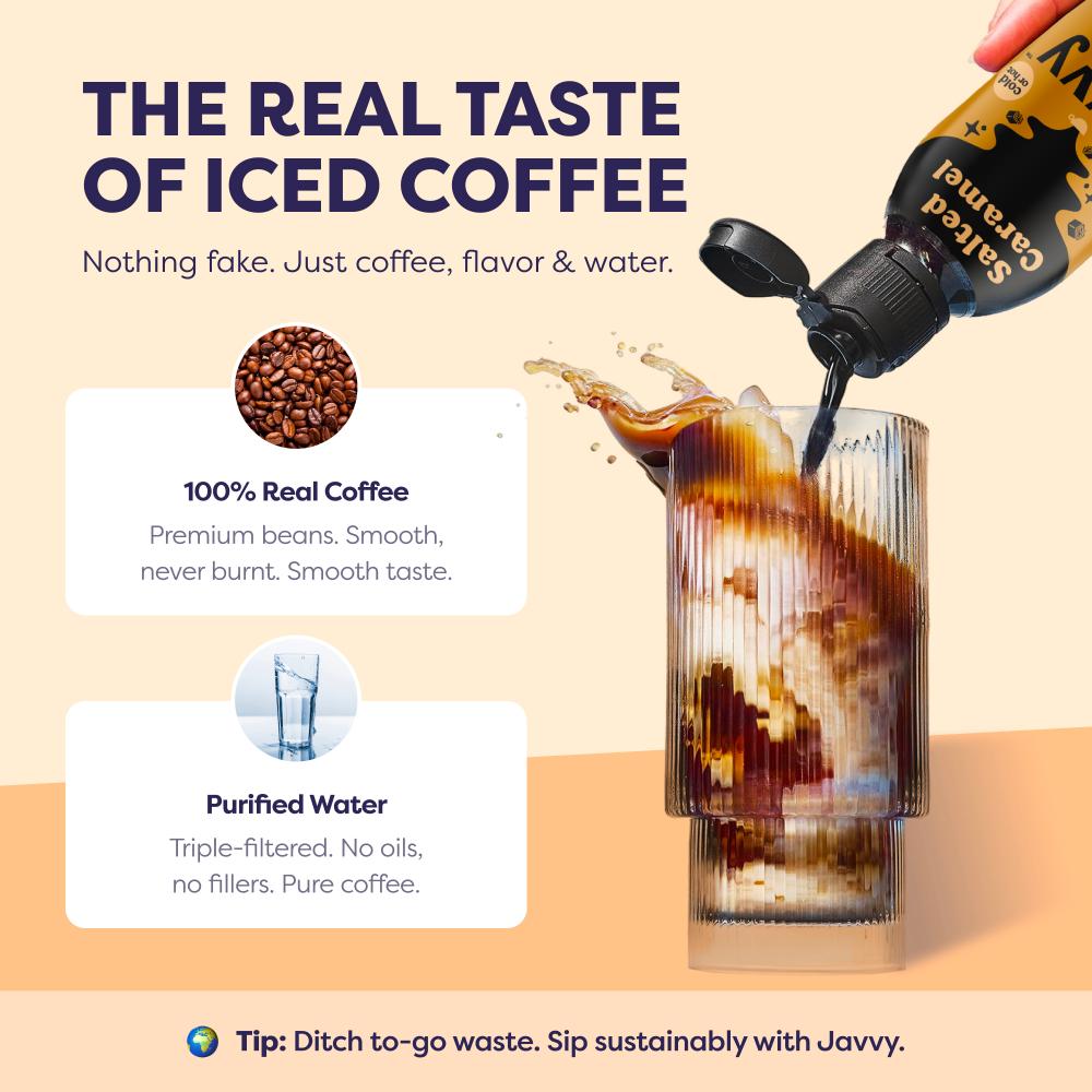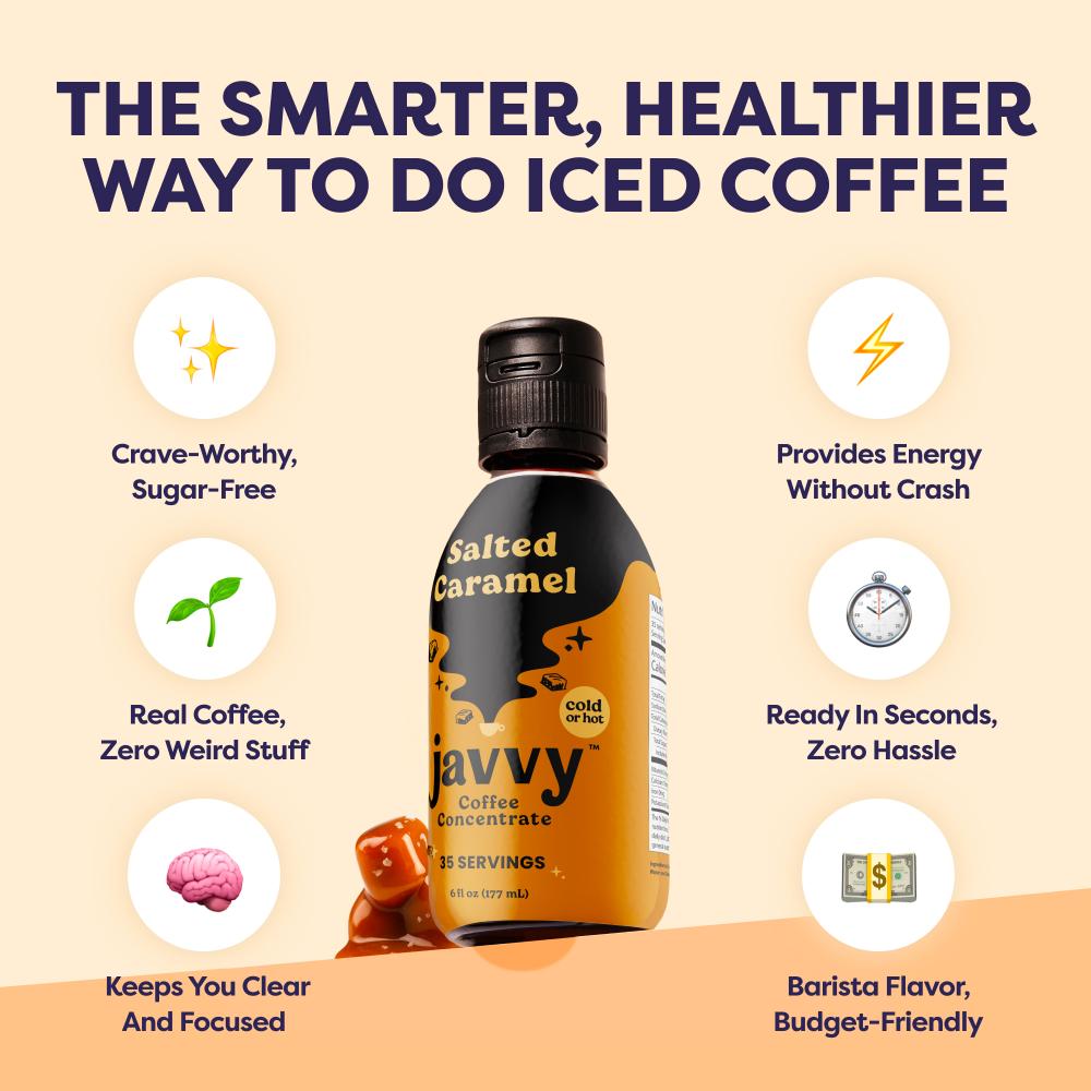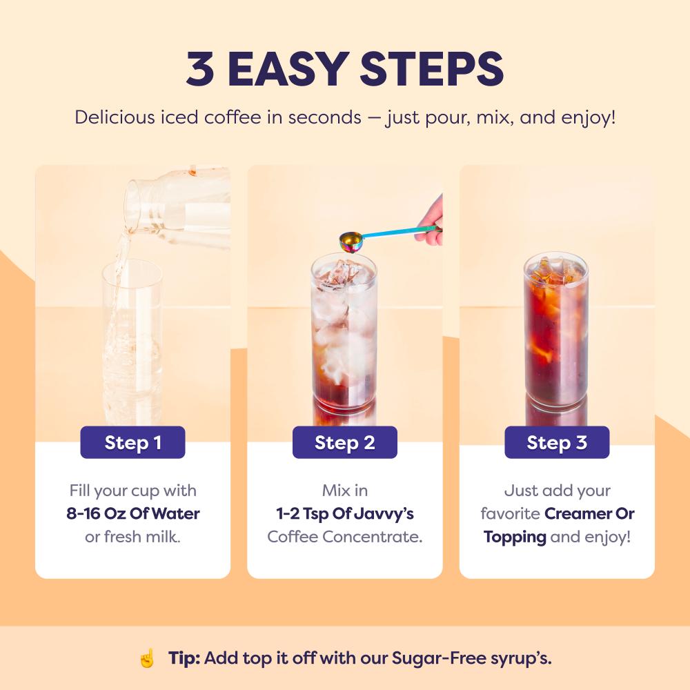 Javvy Coffee Concentrate is the fastest, easiest way to enjoy better coffee - without the sugar, hassle, or compromise. Javvy Coffee Concentrate delivers 100% real coffee with naturally derived ingredients, zero sugar, and no artificial flavors, all in a variety of crave-worthy options. With 60mg of caffeine per serving, each bottle brews up 35 rich, satisfying cups — hot or iced — in seconds. It’s gluten-free and guilt-free, so you can indulge in better-tasting coffee, faster. With this bundle, you’ll also receive a recipe booklet featuring our customers’ favorite creations.