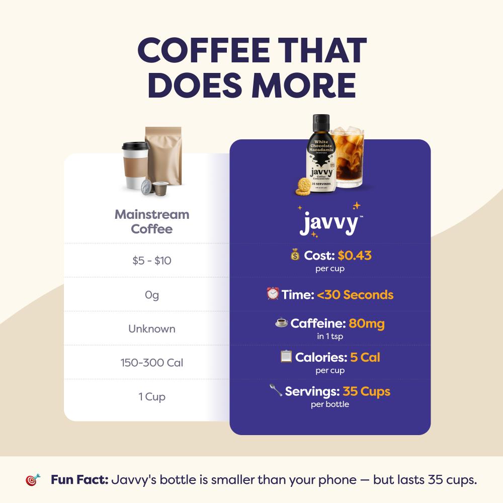 Javvy Coffee Concentrate is the fastest, easiest way to enjoy better coffee - without the sugar, hassle, or compromise. Javvy Coffee Concentrate delivers 100% real coffee with naturally derived ingredients, zero sugar, and no artificial flavors, all in a variety of crave-worthy options. With 60mg of caffeine per serving, each bottle brews up 35 rich, satisfying cups — hot or iced — in seconds. It’s gluten-free and guilt-free, so you can indulge in better-tasting coffee, faster. With this bundle, you’ll also receive a recipe booklet featuring our customers’ favorite creations.